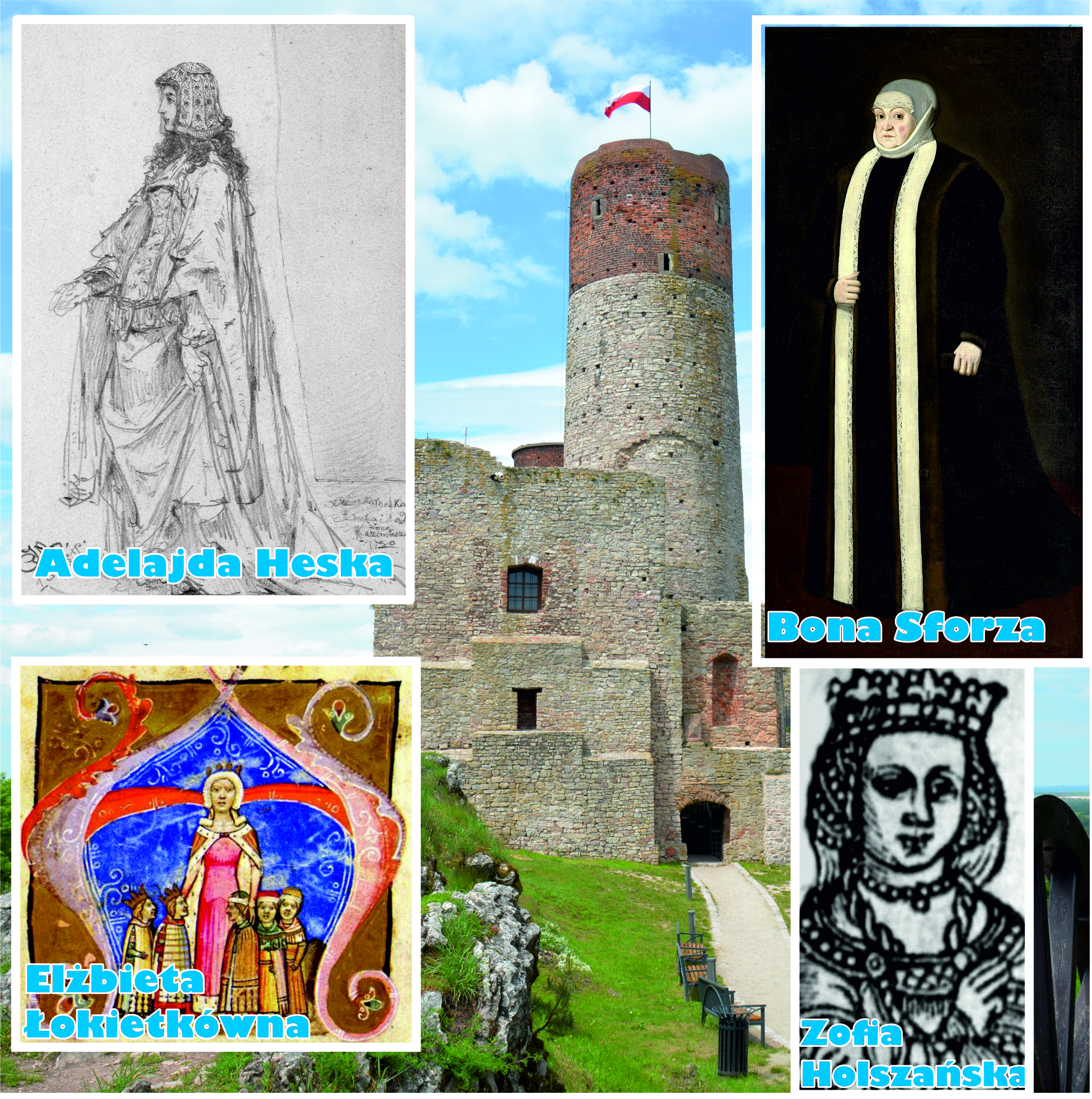 Jedną z ciekawszych postaci była królowa Adelajda Heska. Była ona córką Henryka II Żelaznego, landgrafa heskiego, dla którego ślub córki z władcą Polski był niemałą nobilitacją. Kazimierz poślubił niemiecką księżniczkę (uchodzącą według Jana Długosza za piękną i cnotliwą) w 1341 r. Początkowo pożycie między małżonkami zdawało się być udane, jednak po kilkunastu latach nastał poważny kryzys. Wynikał on głównie z tego, że Adelajda nie dała królowi żadnego potomstwa, najwidoczniej będąc bezpłodną. Kazimierz znany był poza tym ze swojego hulaszczego życia, co doprowadziło w 1355 r. do separacji małżonków. Król postanowił oddelegować królową poza Wawel. Choć większość czasu związana była ona z zamkiem w Żarnowcu, to część przymusowej „emigracji” spędziła właśnie w naszej chęcińskiej twierdzy. Adelajda po latach w Polsce powróciła do rodzinnej Hesji, śledząc jednak nadal krakowskie życie dworskie. Wielokrotnie starała się o udowodnienie winy Kazimierza, który jeszcze dwukrotnie wziął ślub z czasie swojego panowania. Nie udało jej się to, jednak samego króla przeżyła – zmarła bowiem w 1371 r., rok po śmierci ostatniego przedstawiciela dynastii piastowskiej.